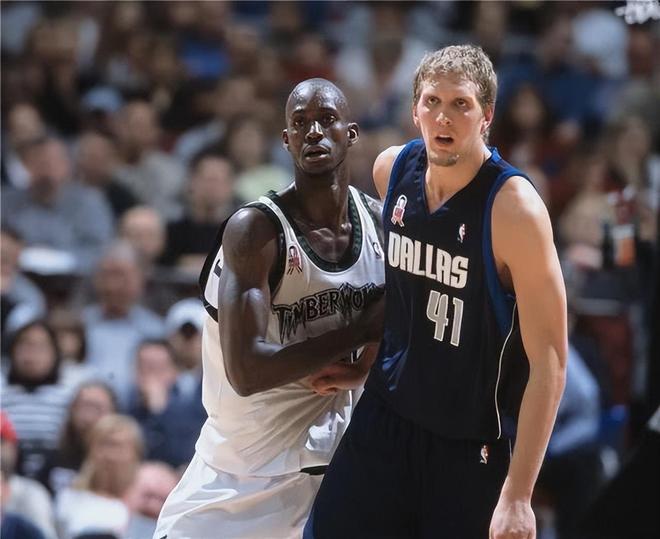 再看加内特,两人有许多相似之处,都是运动能力劲爆,身高臂展一流的大个子,并且都是守强攻弱,有不错投篮能力的大个子。加内特是高中生球员,当年第5顺位就被选中了。早期效力于森林狼队,虽然他没有拿到过盖帽王,但先后4次拿到篮板王,也是个狠角色,巅峰赛季场均24.2分13.9篮板5助攻2.2盖帽极其的全面。